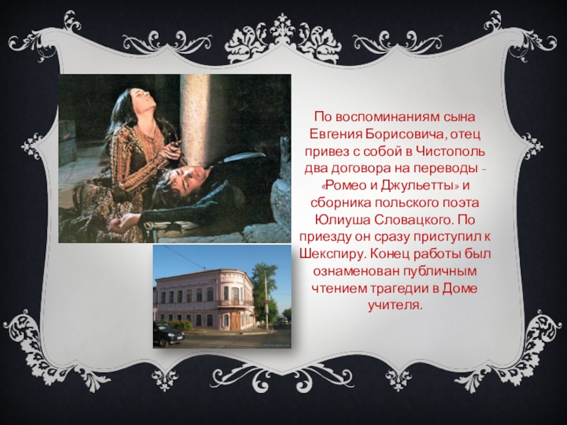 два договора на переводы - «Ромео и Джульетты» и сборника польского поэта Юлиуша Словацкого. По приезду он сразу приступил к Шекспиру. Конец работы был ознаменован публичным чтением трагедии в Доме учителя.