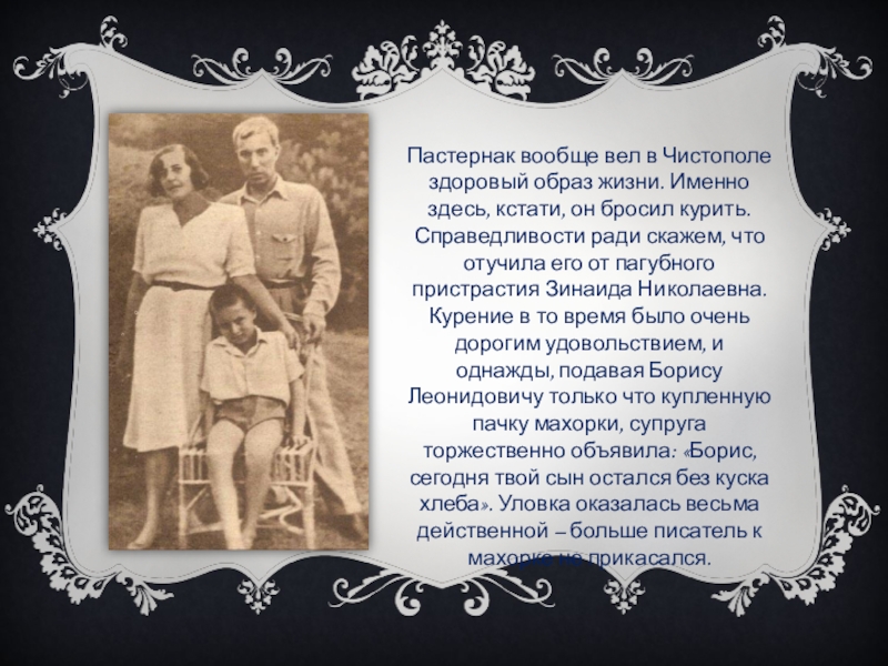 Курение в то время было очень дорогим удовольствием, и однажды, подавая Борису Леонидовичу только что купленную пачку махорки, супруга торжественно объявила: «Борис, сегодня твой сын остался без куска хлеба». Уловка оказалась весьма действенной – больше писатель к махорке не прикасался.