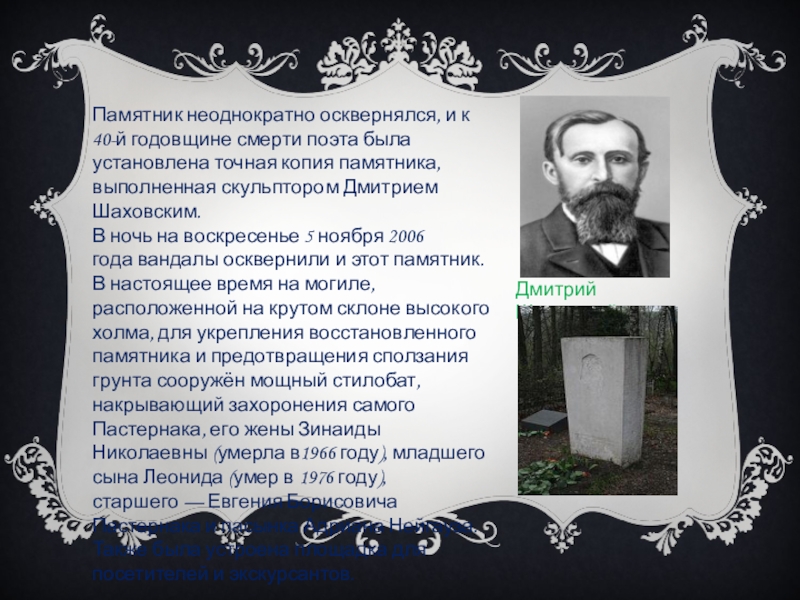 Слайд 21Памятник неоднократно осквернялся, и к 40-й годовщине смерти поэта была установлена