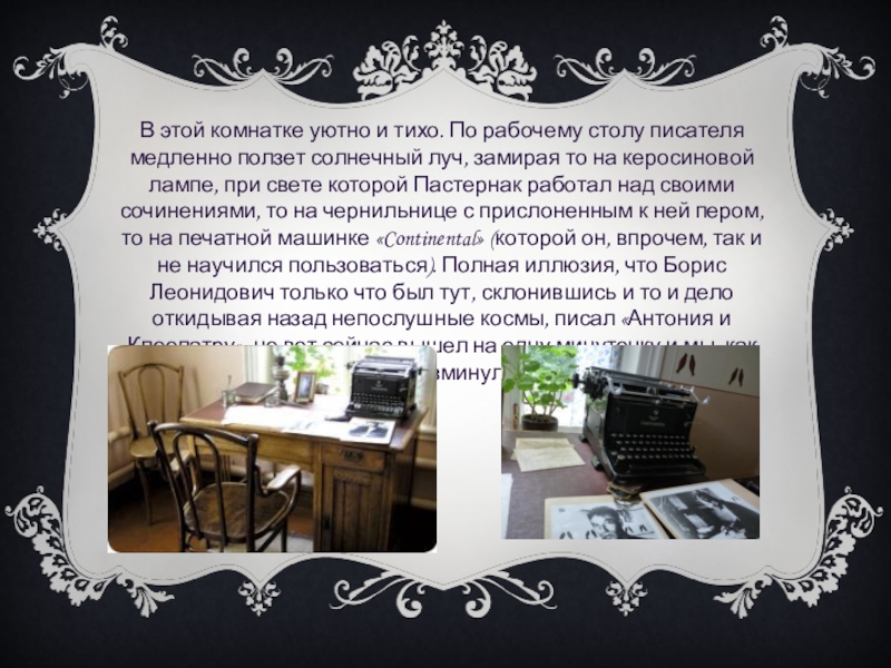 Слайд 5В этой комнатке уютно и тихо. По рабочему столу писателя медленно