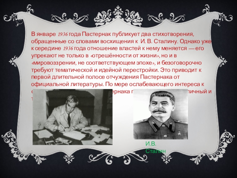 восхищения к И. В. Сталину. Однако уже к середине 1936 года отношение властей к нему меняется — его упрекают не только в «отрешённости от жизни», но и в «мировоззрении, не соответствующем эпохе», и безоговорочно требуют тематической и идейной перестройки. Это приводит к первой длительной полосе отчуждения Пастернака от официальной литературы. По мере ослабевающего интереса к советской власти, стихи Пастернака приобретают более личный и трагический оттенок.