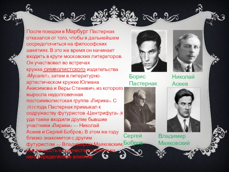 философских занятиях. В это же время он начинает входить в круги московских литераторов. Он участвовал во встречах кружка символистского издательства «Мусагет», затем в литературно-артистическом кружке Юлиана Анисимова и Веры Станевич, из которого выросла недолговечная постсимволистская группа «Лирика». С 1914 года Пастернак примыкал к содружеству футуристов «Центрифуга» (куда также входили другие бывшие участники «Лирики» — Николай Асеев и Сергей Бобров). В этом же году близко знакомится с другим футуристом — Владимиром Маяковским, чья личность и творчество оказали на него определённое влияние