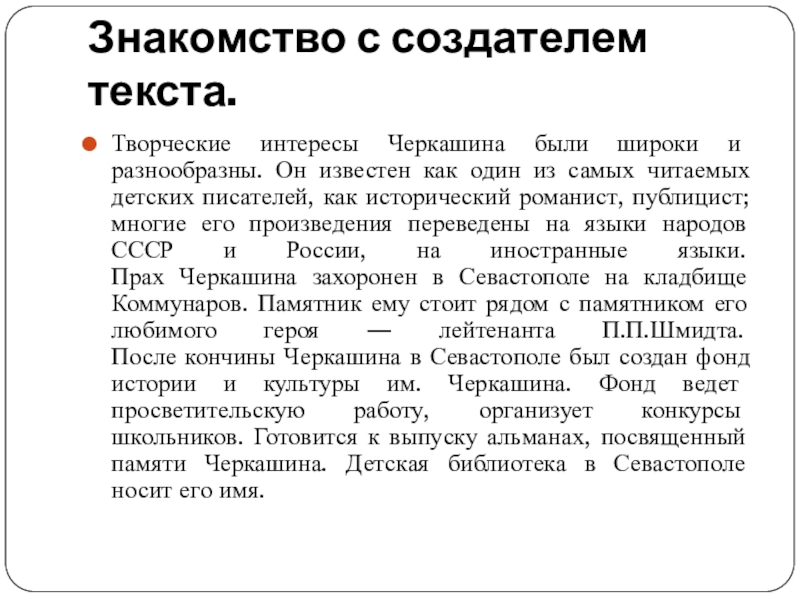 Творческие интересы Черкашина были широки и разнообразны. Он