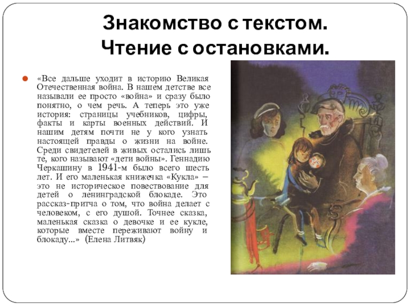 война. В нашем детстве все называли ее просто «война» и сразу было понятно, о чем речь. А теперь это уже история: страницы учебников, цифры, факты и карты военных действий. И нашим детям почти не у кого узнать настоящей правды о жизни на войне. Среди свидетелей в живых остались лишь те, кого называют «дети войны». Геннадию Черкашину в 1941-м было всего шесть лет. И его маленькая книжечка «Кукла» – это не историческое повествование для детей о ленинградской блокаде. Это рассказ-притча о том, что война делает с человеком, с его душой. Точнее сказка, маленькая сказка о девочке и ее кукле, которые вместе переживают войну и блокаду…» (Елена Литвяк)