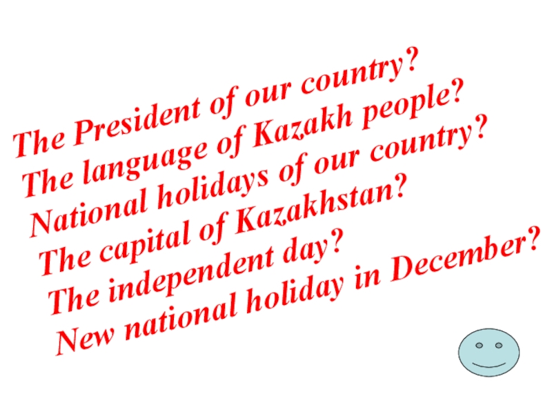 The President of our country?The language of Kazakh people?National holidays of our country?The capital of Kazakhstan?The independent