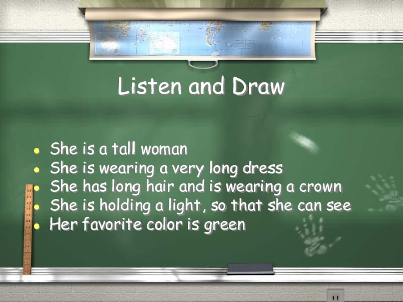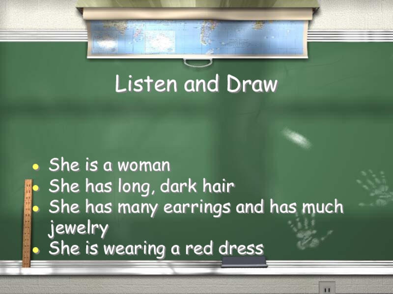 Listen and DrawShe is a tall womanShe is wearing a very long dressShe has long hair and
