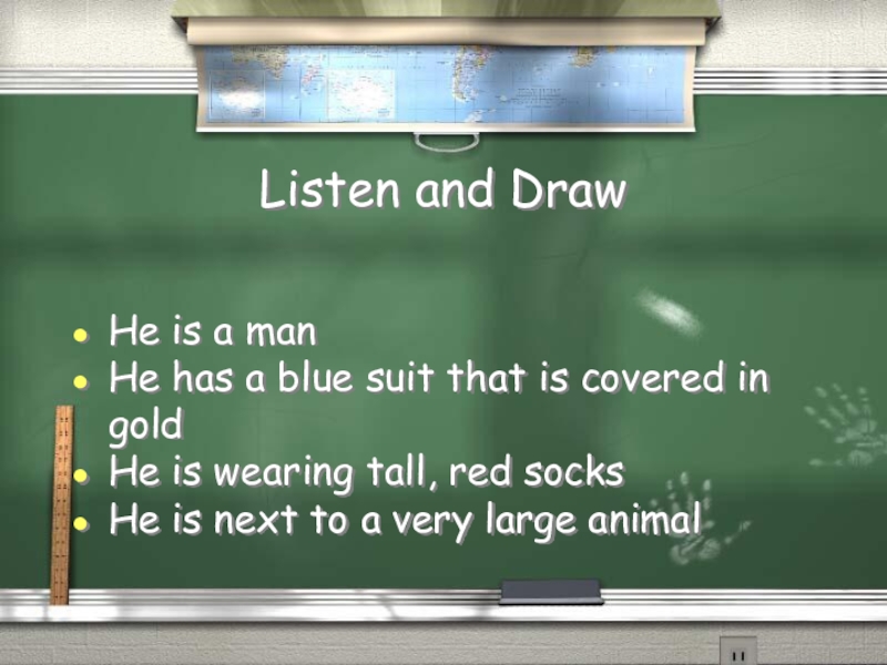 Listen and DrawHe is a manHe has a blue suit that is covered in goldHe is wearing