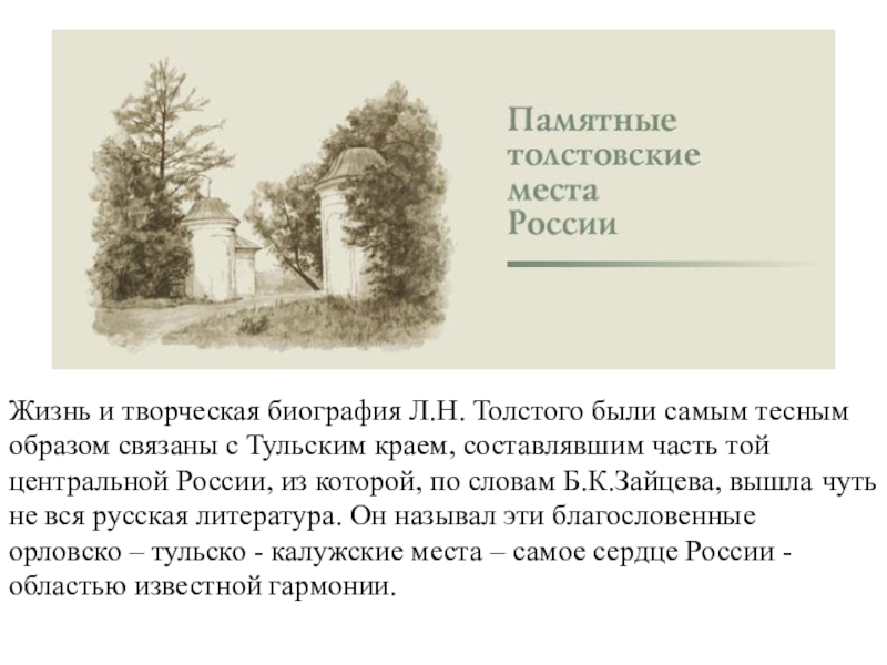с Тульским краем, составлявшим часть той центральной России, из которой, по словам Б.К.Зайцева, вышла чуть не вся русская литература. Он называл эти благословенные орловско – тульско - калужские места – самое сердце России - областью известной гармонии.
