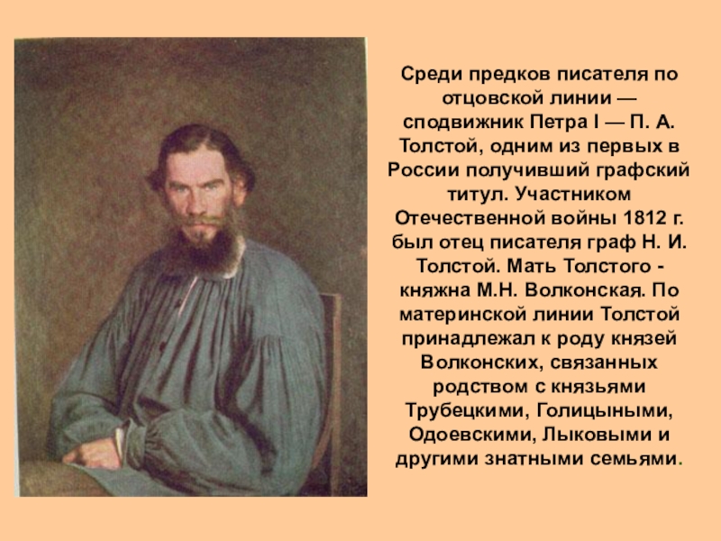 П. А. Толстой, одним из первых в России получивший графский титул. Участником Отечественной войны 1812 г. был отец писателя граф Н. И. Толстой. Мать Толстого - княжна М.Н. Волконская. По материнской линии Толстой принадлежал к роду князей Волконских, связанных родством с князьями Трубецкими, Голицыными, Одоевскими, Лыковыми и другими знатными семьями.