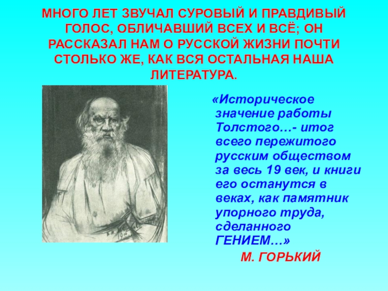 «Историческое значение работы Толстого…- итог всего пережитого русским обществом за весь 19 век, и книги его останутся в веках, как памятник упорного труда, сделанного ГЕНИЕМ…»