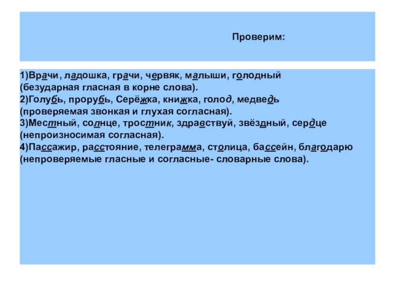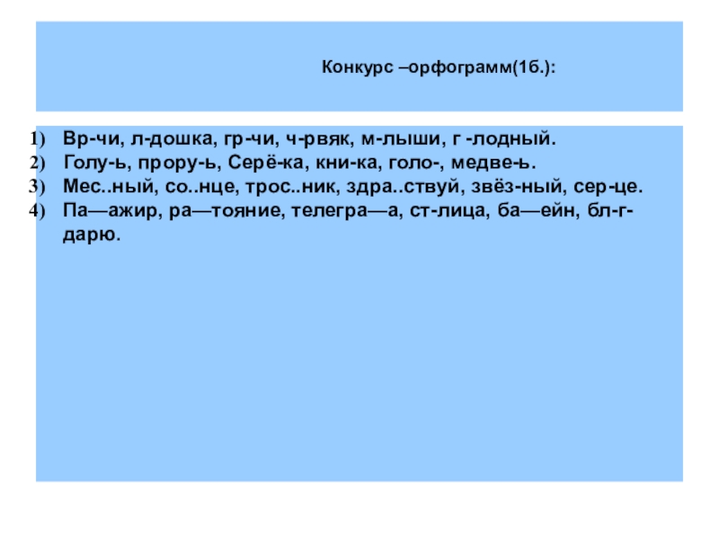 Вр-чи, л-дошка, гр-чи, ч-рвяк, м-лыши, г -лодный.