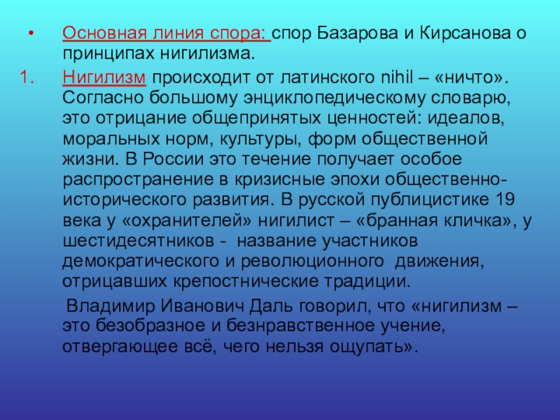Владимир Иванович Даль говорил, что «нигилизм – это безобразное и безнравственное учение, отвергающее всё, чего нельзя ощупать».