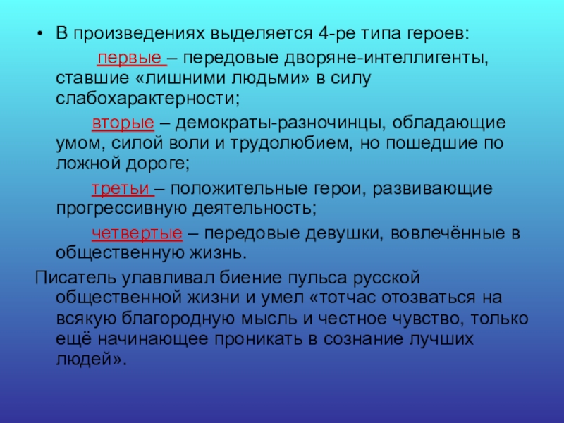 первые – передовые дворяне-интеллигенты, ставшие «лишними людьми» в силу слабохарактерности;