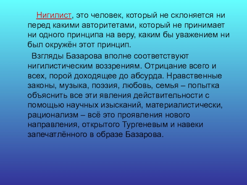 Взгляды Базарова вполне соответствуют нигилистическим воззрениям. Отрицание всего и всех, порой доходящее до абсурда. Нравственные законы, музыка, поэзия, любовь, семья – попытка объяснить все эти явления действительности с помощью научных изысканий, материалистически, рационализм – всё это проявления нового направления, открытого Тургеневым и навеки запечатлённого в образе Базарова.