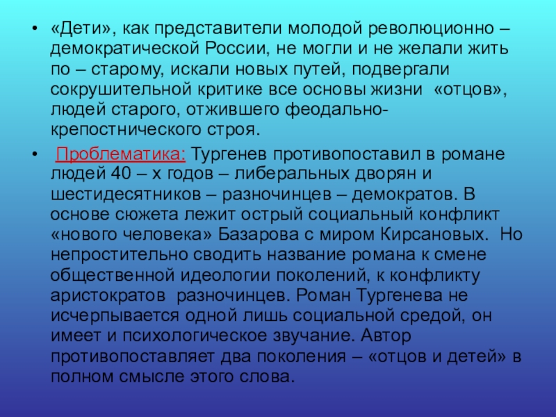 Проблематика: Тургенев противопоставил в романе людей 40 – х годов – либеральных дворян и шестидесятников – разночинцев – демократов. В основе сюжета лежит острый социальный конфликт «нового человека» Базарова с миром Кирсановых. Но непростительно сводить название романа к смене общественной идеологии поколений, к конфликту аристократов разночинцев. Роман Тургенева не исчерпывается одной лишь социальной средой, он имеет и психологическое звучание. Автор противопоставляет два поколения – «отцов и детей» в полном смысле этого слова.