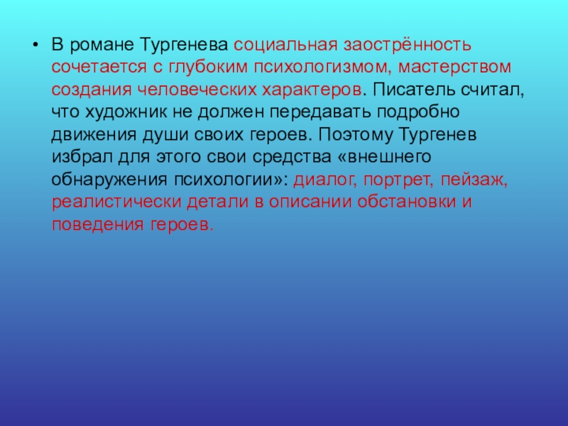 человеческих характеров. Писатель считал, что художник не должен передавать подробно движения души своих героев. Поэтому Тургенев избрал для этого свои средства «внешнего обнаружения психологии»: диалог, портрет, пейзаж, реалистически детали в описании обстановки и поведения героев.