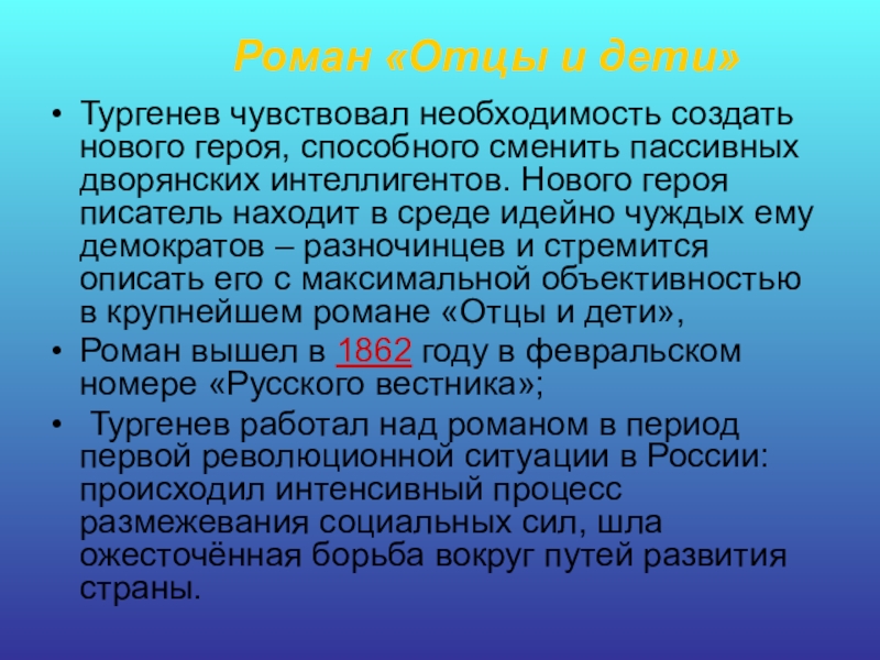 нового героя, способного сменить пассивных дворянских интеллигентов. Нового героя писатель находит в среде идейно чуждых ему демократов – разночинцев и стремится описать его с максимальной объективностью в крупнейшем романе «Отцы и дети»,
