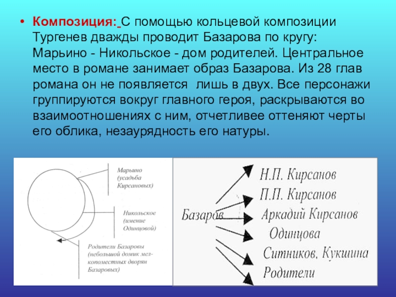Слайд 18Композиция: С помощью кольцевой композиции Тургенев дважды проводит Базарова по кругу: