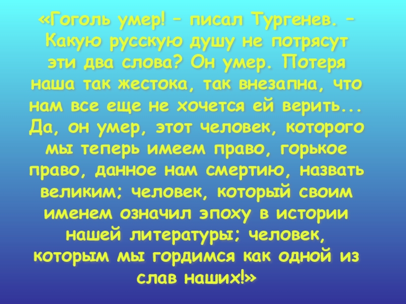 Слайд 10«Гоголь умер! – писал Тургенев. – Какую русскую душу не потрясут