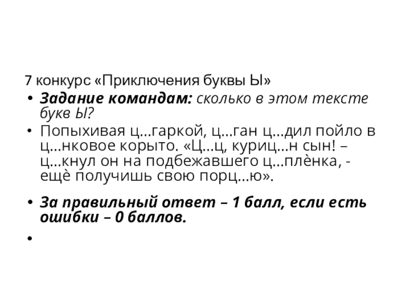 7 конкурс «Приключения буквы Ы»Задание командам: сколько в этом тексте букв Ы?Попыхивая ц…гаркой, ц…ган ц…дил пойло в ц…нковое