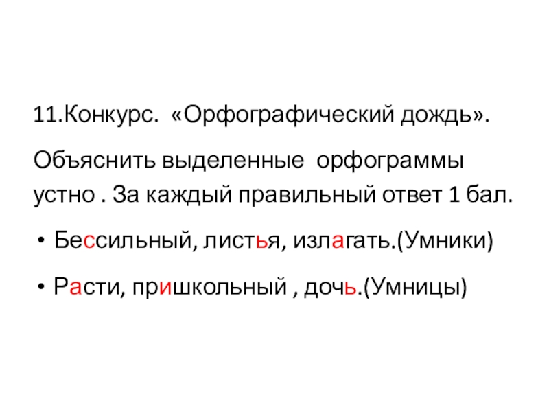 11.Конкурс. «Орфографический дождь».Объяснить выделенные орфограммы устно . За каждый правильный ответ 1 бал. Бессильный, листья, излагать.(Умники)Расти, пришкольный
