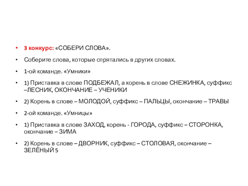 3 конкурс: «СОБЕРИ СЛОВА».Соберите слова, которые спрятались в других словах.1-ой команде. «Умники»1) Приставка в слове ПОДБЕЖАЛ, а корень