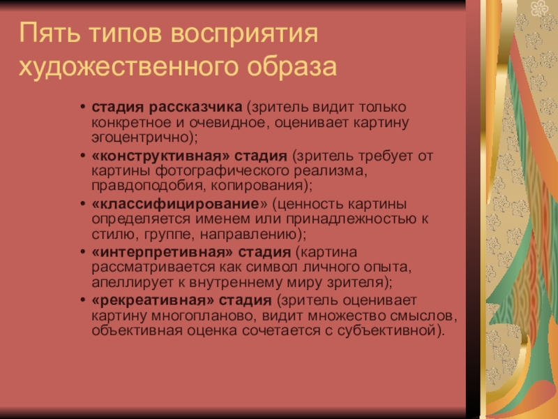 Слайд 16Пять типов восприятия художественного образа