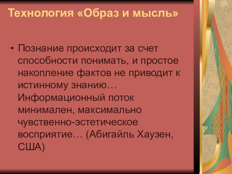 простое накопление фактов не приводит к истинному знанию… Информационный поток минимален, максимально чувственно-эстетическое восприятие… (Абигайль Хаузен, США)