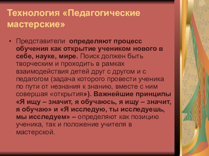 себе, науке, мире. Поиск должен быть творческим и проходить в рамках взаимодействия детей друг с другом и с педагогом (задача которого провести ученика по пути от незнания к знанию, вместе с ним совершая «открытия»). Важнейшие принципы «Я ищу – значит, я обучаюсь, я ищу – значит, я обучаю» и «Я исследую, ты исследуешь, мы исследуем» – определяют как позицию ученика, так и положение учителя в мастерской.