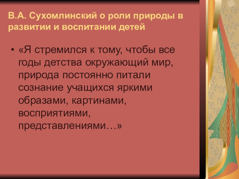Слайд 7В.А. Сухомлинский о роли природы в развитии и воспитании детей