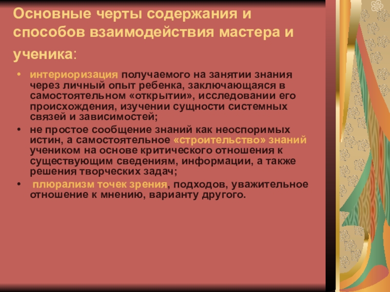 Слайд 12Основные черты содержания и способов взаимодействия мастера и ученика: