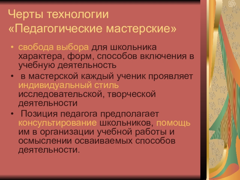 Слайд 13Черты технологии «Педагогические мастерские»