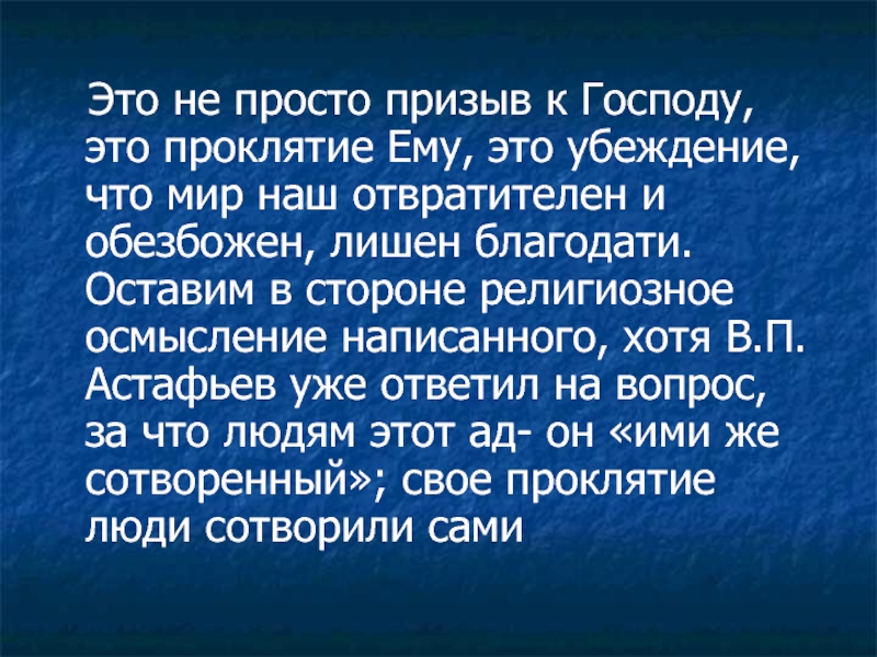 это убеждение, что мир наш отвратителен и обезбожен, лишен благодати. Оставим в стороне религиозное осмысление написанного, хотя В.П.Астафьев уже ответил на вопрос, за что людям этот ад- он «ими же сотворенный»; свое проклятие люди сотворили сами