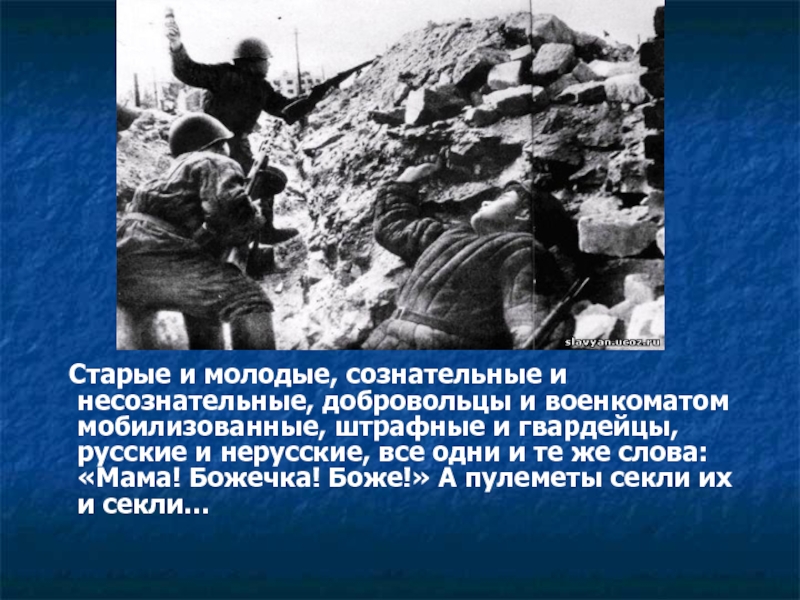 мобилизованные, штрафные и гвардейцы, русские и нерусские, все одни и те же слова: «Мама! Божечка! Боже!» А пулеметы секли их и секли…