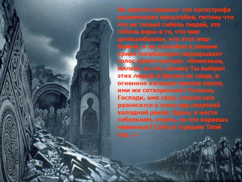 только гибель людей, это гибель веры в то, что мир целесообразен, что этот мир- Божий, и не случайно в романе крики погибающих перекрывает голос самого автора: «Боженька, милый, за что, почему Ты выбрал этих людей и бросил их сюда, в огненное кипящее земное пекло, ими же сотворенное? Услышь, Господи, имя свое, стоном оно разносится в ночи над смертной холодной рекой. Здесь, в месте гибельном, ответь, за что караешь невинных? Слеп и страшен Твой суд…»