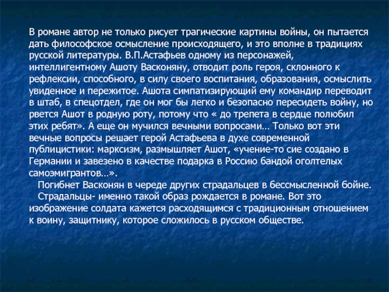 философское осмысление происходящего, и это вполне в традициях русской литературы. В.П.Астафьев одному из персонажей, интеллигентному Ашоту Васконяну, отводит роль героя, склонного к рефлексии, способного, в силу своего воспитания, образования, осмыслить увиденное и пережитое. Ашота симпатизирующий ему командир переводит в штаб, в спецотдел, где он мог бы легко и безопасно пересидеть войну, но рвется Ашот в родную роту, потому что « до трепета в сердце полюбил этих ребят». А еще он мучился вечными вопросами… Только вот эти вечные вопросы решает герой Астафьева в духе современной публицистики: марксизм, размышляет Ашот, «учение-то сие создано в Германии и завезено в качестве подарка в Россию бандой оголтелых самоэмигрантов…».