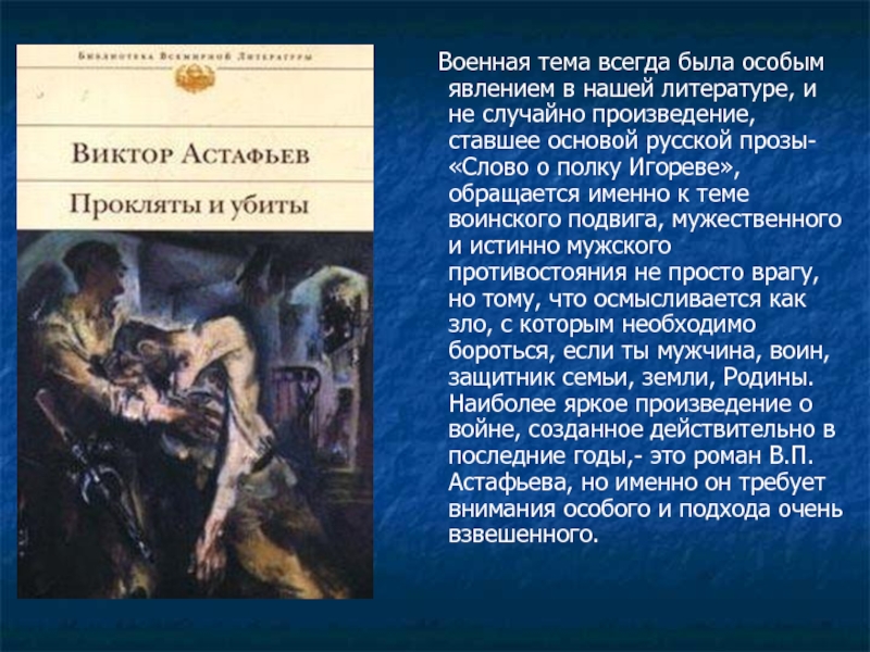 и не случайно произведение, ставшее основой русской прозы- «Слово о полку Игореве», обращается именно к теме воинского подвига, мужественного и истинно мужского противостояния не просто врагу, но тому, что осмысливается как зло, с которым необходимо бороться, если ты мужчина, воин, защитник семьи, земли, Родины. Наиболее яркое произведение о войне, созданное действительно в последние годы,- это роман В.П.Астафьева, но именно он требует внимания особого и подхода очень взвешенного.