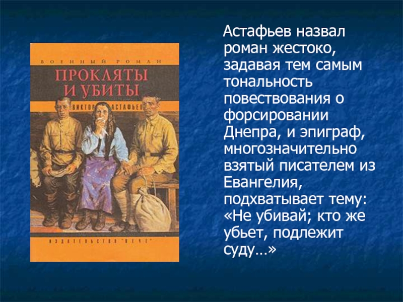 о форсировании Днепра, и эпиграф, многозначительно взятый писателем из Евангелия, подхватывает тему: «Не убивай; кто же убьет, подлежит суду…»