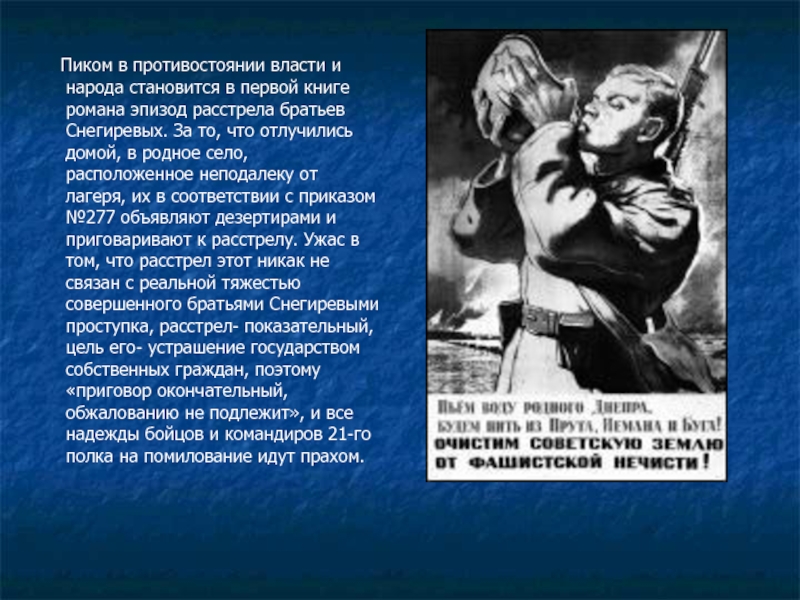 книге романа эпизод расстрела братьев Снегиревых. За то, что отлучились домой, в родное село, расположенное неподалеку от лагеря, их в соответствии с приказом №277 объявляют дезертирами и приговаривают к расстрелу. Ужас в том, что расстрел этот никак не связан с реальной тяжестью совершенного братьями Снегиревыми проступка, расстрел- показательный, цель его- устрашение государством собственных граждан, поэтому «приговор окончательный, обжалованию не подлежит», и все надежды бойцов и командиров 21-го полка на помилование идут прахом.