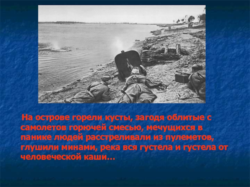 смесью, мечущихся в панике людей расстреливали из пулеметов, глушили минами, река вся густела и густела от человеческой каши…