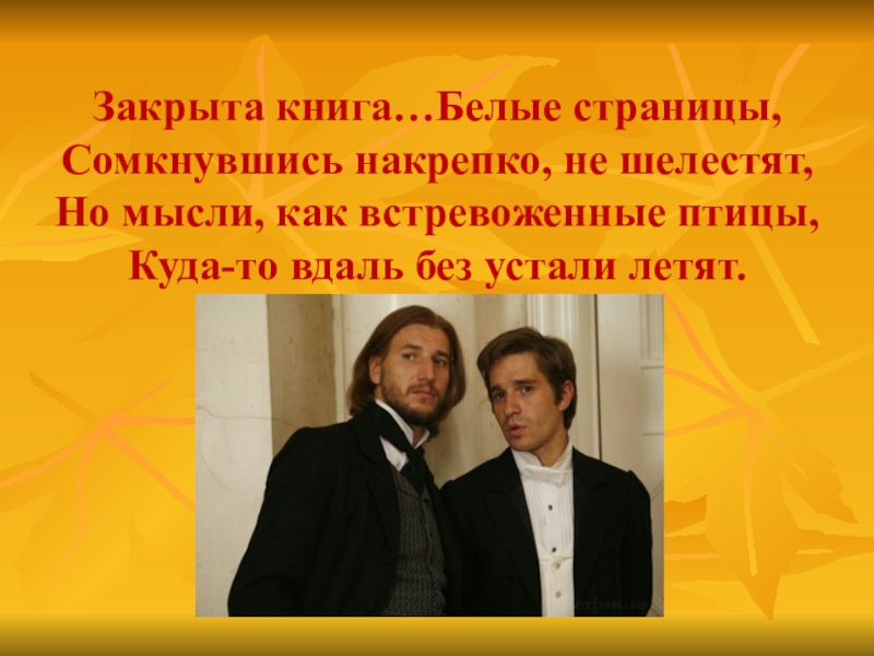 Слайд 12Закрыта книга…Белые страницы, Сомкнувшись накрепко, не шелестят, Но мысли, как встревоженные птицы, Куда-то вдаль