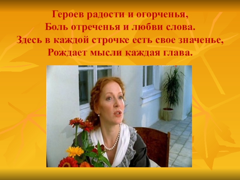 Слайд 14 Героев радости и огорченья, Боль отреченья и любви слова. Здесь в каждой строчке