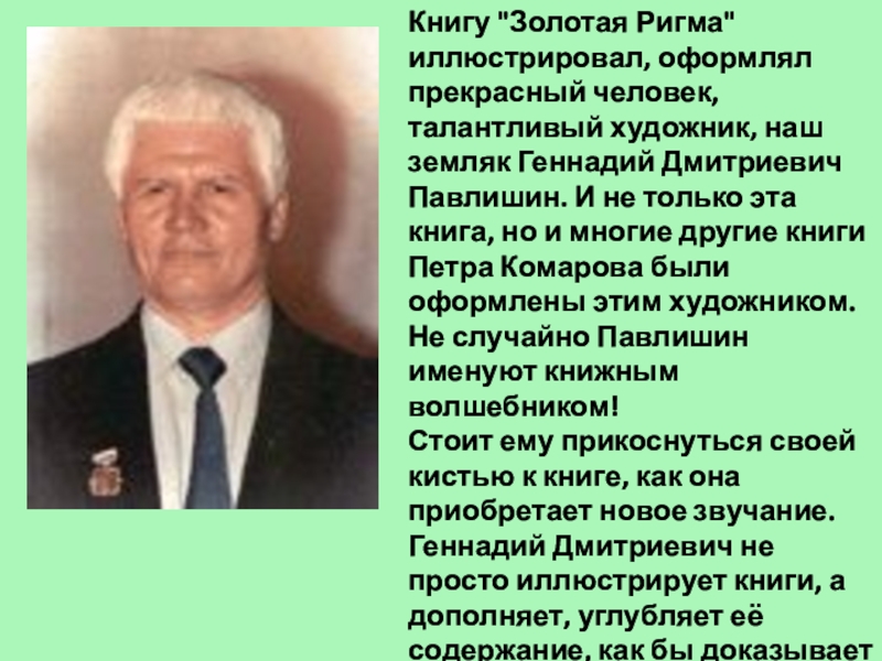 Слайд 13Книгу "Золотая Ригма" иллюстрировал, оформлял прекрасный человек, талантливый художник, наш земляк