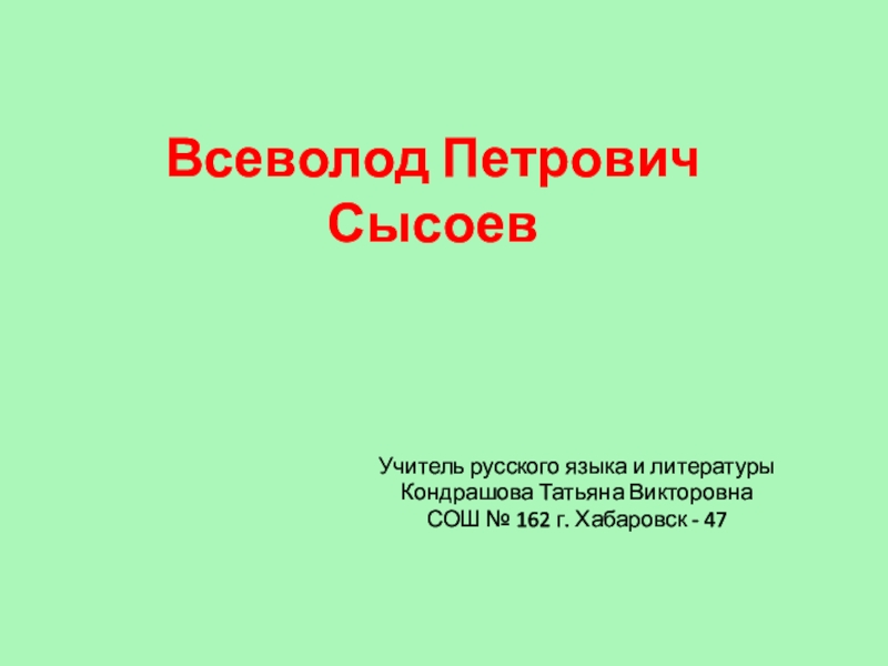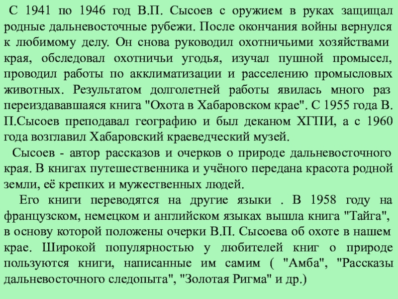 руках защищал родные дальневосточные рубежи. После окончания войны вернулся к любимому делу. Он снова руководил охотничьими хозяйствами края, обследовал охотничьи угодья, изучал пушной промысел, проводил работы по акклиматизации и расселению промысловых животных. Результатом долголетней работы явилась много раз переиздававшаяся книга "Охота в Хабаровском крае". С 1955 года В.П.Сысоев преподавал географию и был деканом ХГПИ, а с 1960 года возглавил Хабаровский краеведческий музей.