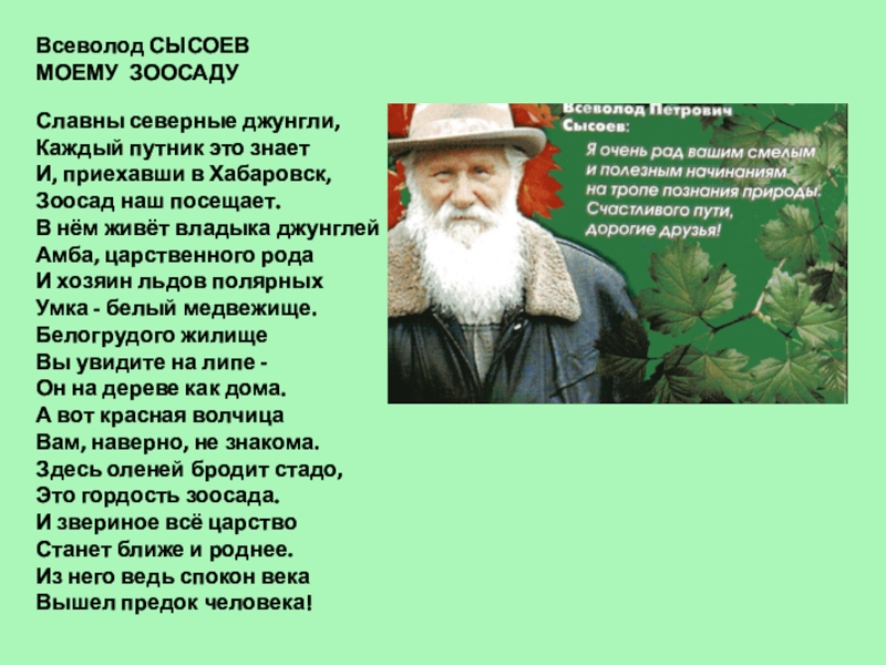 края стала поистине знаковой. С ним связаны литературная жизнь и краеведческие научные изыскания, путешествия и открытия в изучении дальневосточной тайги. Он считает, что нашу неповторимую природу нужно любить не на словах, а на деле. Именно этому посвятил свою жизнь наш земляк, почётный гражданин города Хабаровска Всеволод Петрович Сысоев.