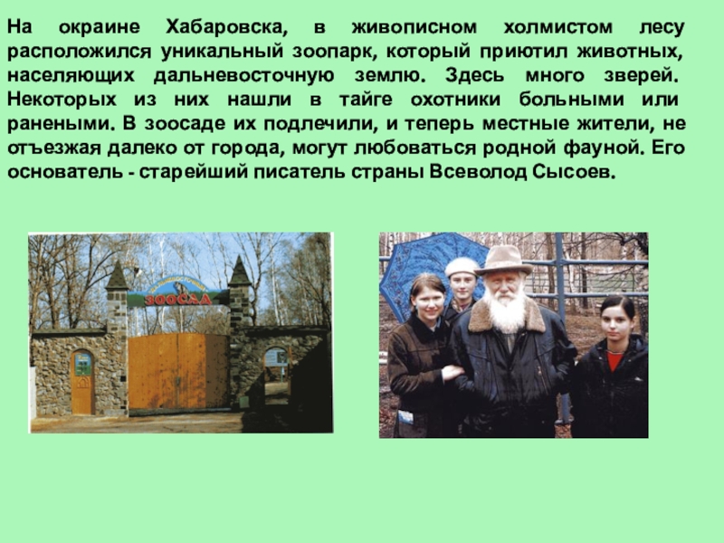 приютил животных, населяющих дальневосточную землю. Здесь много зверей. Некоторых из них нашли в тайге охотники больными или ранеными. В зоосаде их подлечили, и теперь местные жители, не отъезжая далеко от города, могут любоваться родной фауной. Его основатель - старейший писатель страны Всеволод Сысоев.