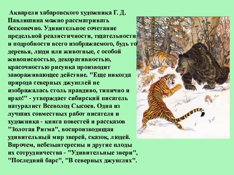 сочетание предельной реалистичности, тщательности и подробности всего изображаемого, будь то деревья, люди или животные, с особой живописностью, декоративностью, красочностью рисунка производит завораживающее действие. "Еще никогда природа северных джунглей не изображалась столь правдиво, типично и ярко!" - утверждает сибирский писатель натуралист Всеволод Сысоев. Одна из лучших совместных работ писателя и художника - книга повестей и рассказов "Золотая Ригма", воспроизводящая удивительный мир зверей, сказок, людей. Впрочем, небезынтересны и другие плоды их сотрудничества - "Удивительные звери", "Последний барс", "В северных джунглях".