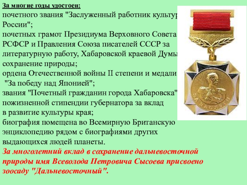 За многолетний вклад в сохранение дальневосточной природы имя Всеволода Петровича Сысоева присвоено зоосаду "Дальневосточный".