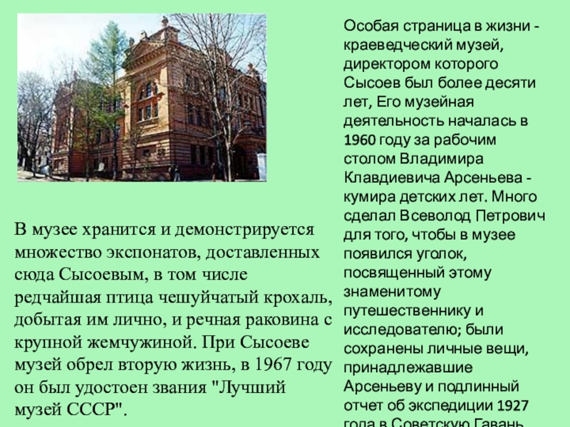Слайд 7Особая страница в жизни - краеведческий музей, директором которого Сысоев был