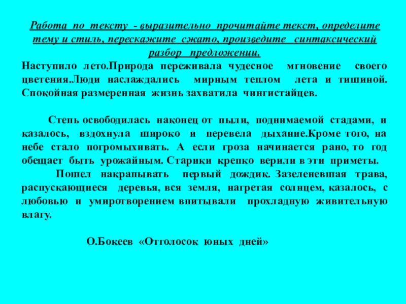 Слайд 13Работа по тексту - выразительно прочитайте текст, определите тему и стиль,